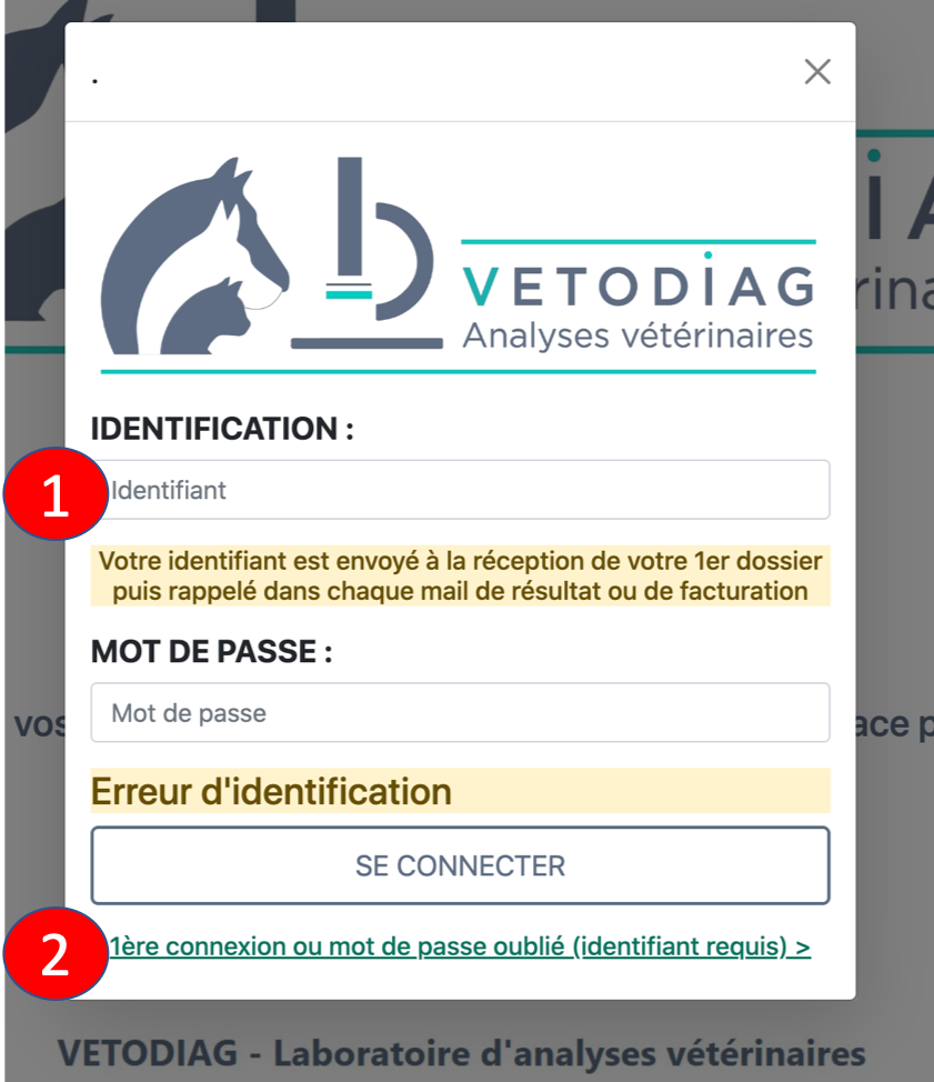 2ème possibilité : votre espace est aussi accessible à partir de chaque e-mail de résultat ou de facturation qui contient le lien d'accès et votre identifiant. Après avoir renseigné votre identifiant (1), vous pouvez créer ou réinitialiser votre mot de passe (2).